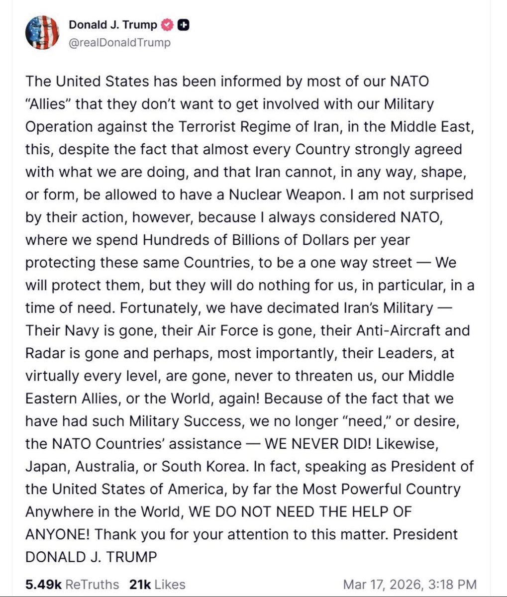 “由于我们取得了如此巨大的军事成功,我们不再需要或希望北约国家的协助——我们从未需要过!同样,日本、澳大利亚或韩国也是如此。事实上,作为美利坚合众国总统——这个世界上迄今最强大的国家——我们不需要任何人的帮助!”