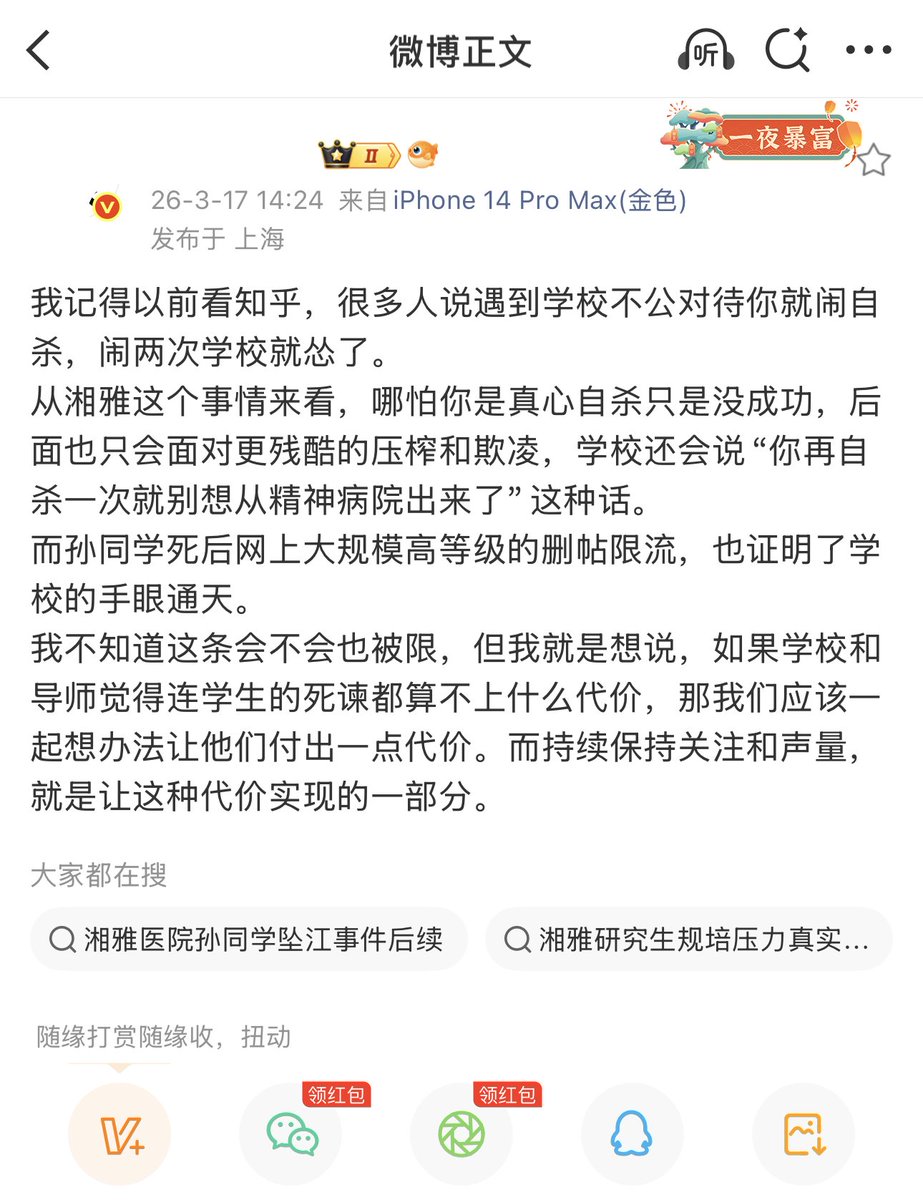 3月17日,一名博主发文:我记得以前看知乎,很多人说遇到学校不公对待你就闹自杀,闹两次学校就怂了。但从湘雅这个事情来看,哪怕你是真心自杀只是没成功,后面也只会面对更残酷的压榨和欺凌,学校还会说“你再自杀一次就别想从精神病院出来了”这种话。