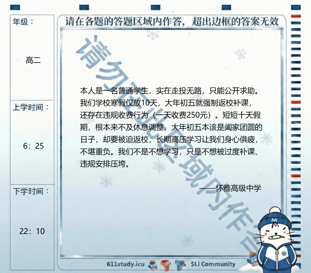 怀化市怀雅高级中学学生投稿:学校寒假仅有10天,不仅存在违规收费问题,还要求学生在大年初五这一阖家团圆的日子强制返校。长期处于高强度学习环境下,学生身心俱疲,压力沉重,不堪负担。