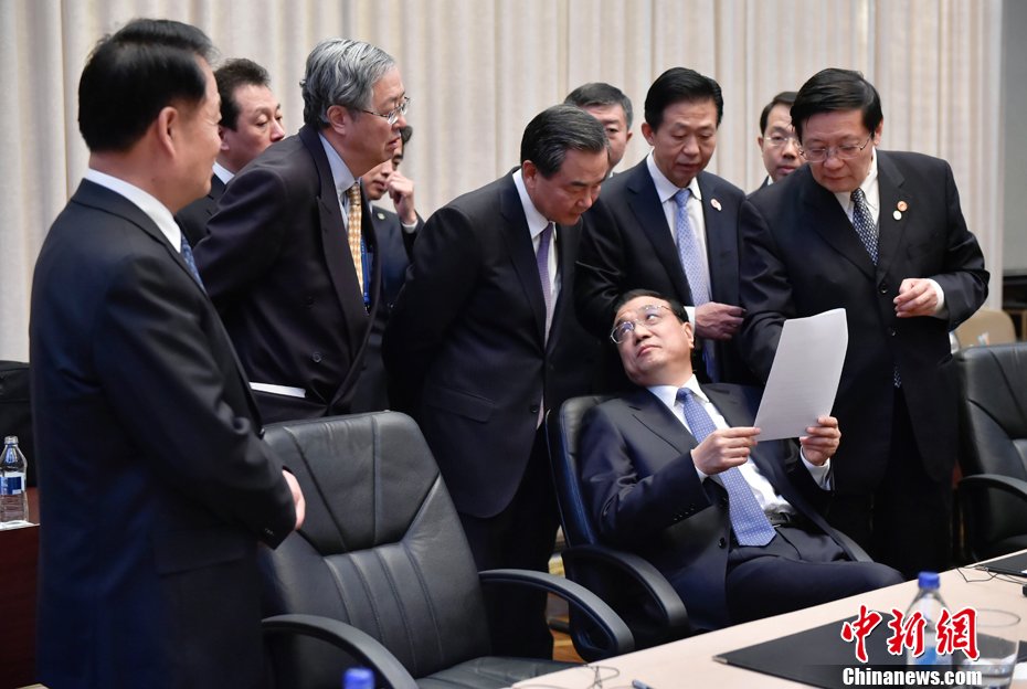 2014年12月李克强出席中国—中东欧国家第四届经贸论坛。当克强总理送走每一位刚刚结束会谈的领导人匆匆赶回座位时,随行的国务院各部部长旋即围拢到他身旁进行会商。中新社 刘震 摄