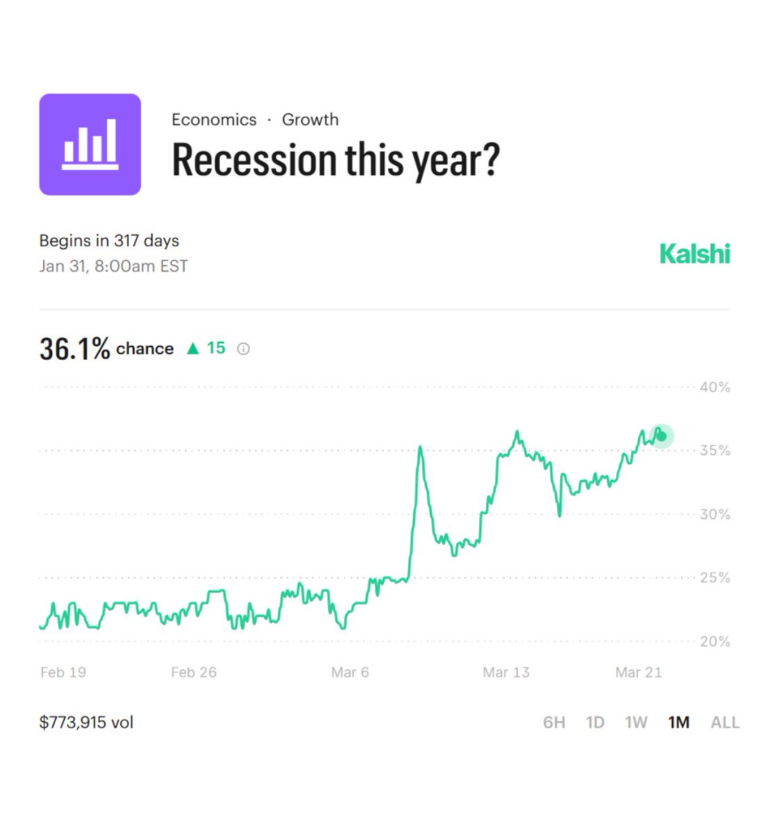 The chances of a US recession this year have risen to 36%, according to prediction market.