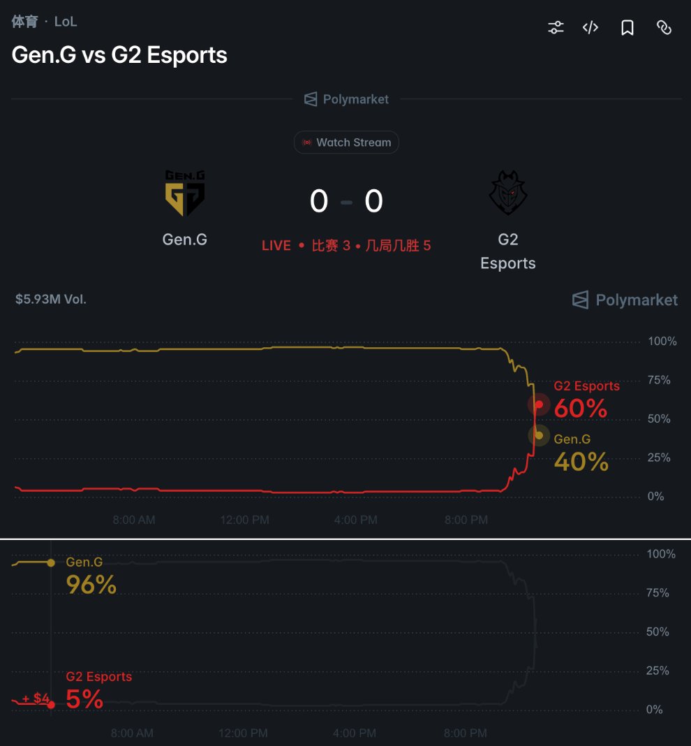 今晚 LoL 先锋赛买 Gen.G 赢的朋友,心率怕不是要飙升了❤️🔥 实力碾压的情况下,Polymarket 上 Gen.G vs G2 的胜率原本是悬殊的 96% vs 5% —— 然而 G2 却连赢两把,目前胜率已更新为 40% vs 60%,在 BO5 中拿下了两个赛点 账户「bossoskil1」持有 316,592 份 G2 获胜的份额,现已累计浮盈超 25 万美元 Gen.G 这要是输了,估计家都回不去了吧…😅
