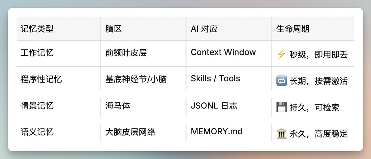 Claude Code中的Agent记忆系统,AI给的类比,感觉像这么回事儿: ① 上下文窗口 = 工作记忆 ② Skill/Tools = 程序性记忆 ③ JSONL对话记录 = 情景记忆 ④ Memory/Claude.md = 语义记忆 好的Agent 记忆架构像睡眠充足的大脑: ① 工作记忆保持清爽(上下文不爆) ② 自动化的交给小脑(技能按需调用) ③ 睡觉时海马体做整理(会话结束后索引日志) ④ 醒来时皮层知识已更新(MEMORY.md 注入新事实)