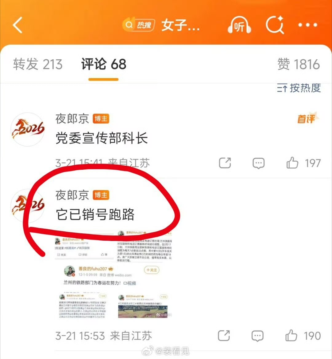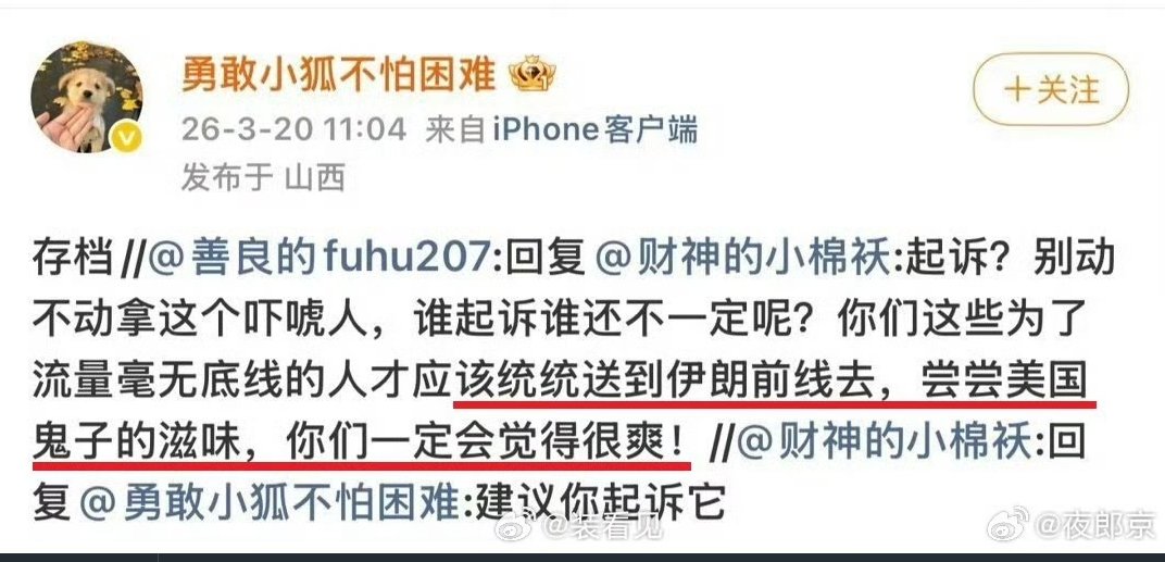 3月20日,兰州铁路局党委宣传科长,辱骂当事人“勇敢小狐”称:“你们这些为了流量毫无底线的人,才应该统统送到伊朗前线区,尝尝美国鬼子的滋味,你们一定会觉得很爽!!”