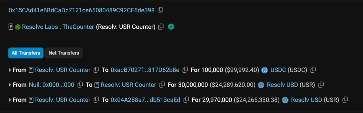 Resolve 攻击者过去 2 小时已用 20 万枚 USDC 累计 Mint 出 8000 万枚 USR,并用这部分资金买入 9191.48 枚 ETH(约 1933 万美元),仍在持续买入中,其中 5500 枚转移至新地址 0x6Db…232Ed