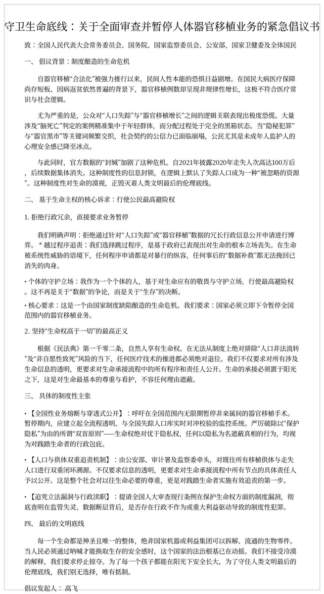 高飞通报:【守卫生命底线:关于全面审查并暂停人体器官移植业务的紧急倡议书】最新进展:
