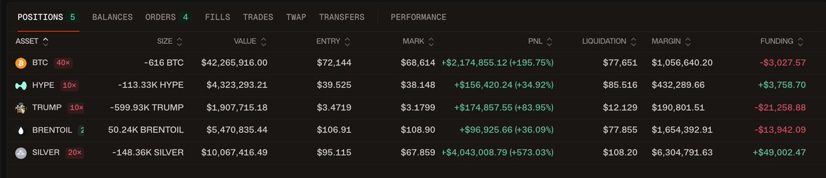 今天上午加仓后他共持有 616 BTC 的 40x 空单,价值 4229 万美元,开仓价 $72144,目前浮盈 215 万美元;此外他还做空了 $HYPE / $TRUMP / $SILVER ,空单总头寸高达 5,858.8 万美元,但做多了价值 546 万美元的 BRENTOIL