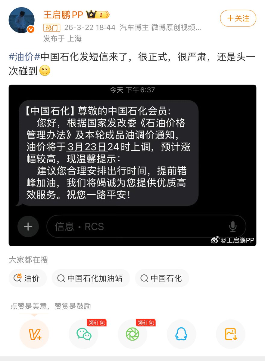 3月23日24时国内油价将迎较大幅度上调,中国石化罕见向会员群发短信,建议车主提前错峰加油以避免扎堆排队。