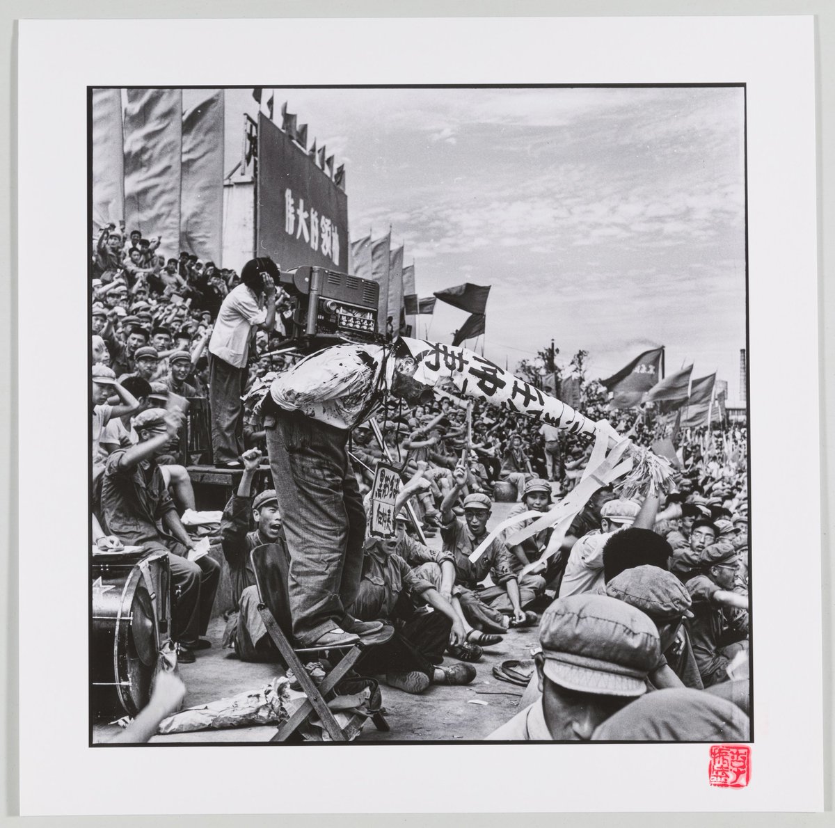 图:时任黑龙江省委书记兼哈尔滨市第一书记任仲夷被红卫兵强迫站在折叠椅上,又被戴上高帽、挂起大牌子,用墨汁涂「鬼脸」