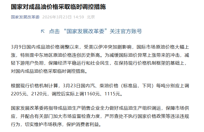 3月23日,国家发展和改革委员会发布通知,针对国际能源市场波动加剧的情况,对国内成品油价格实施临时调控措施。