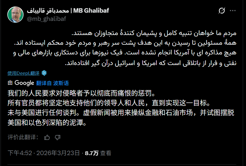 刚刚,伊朗议会议长加利巴夫否认与美国进行过任何谈判。