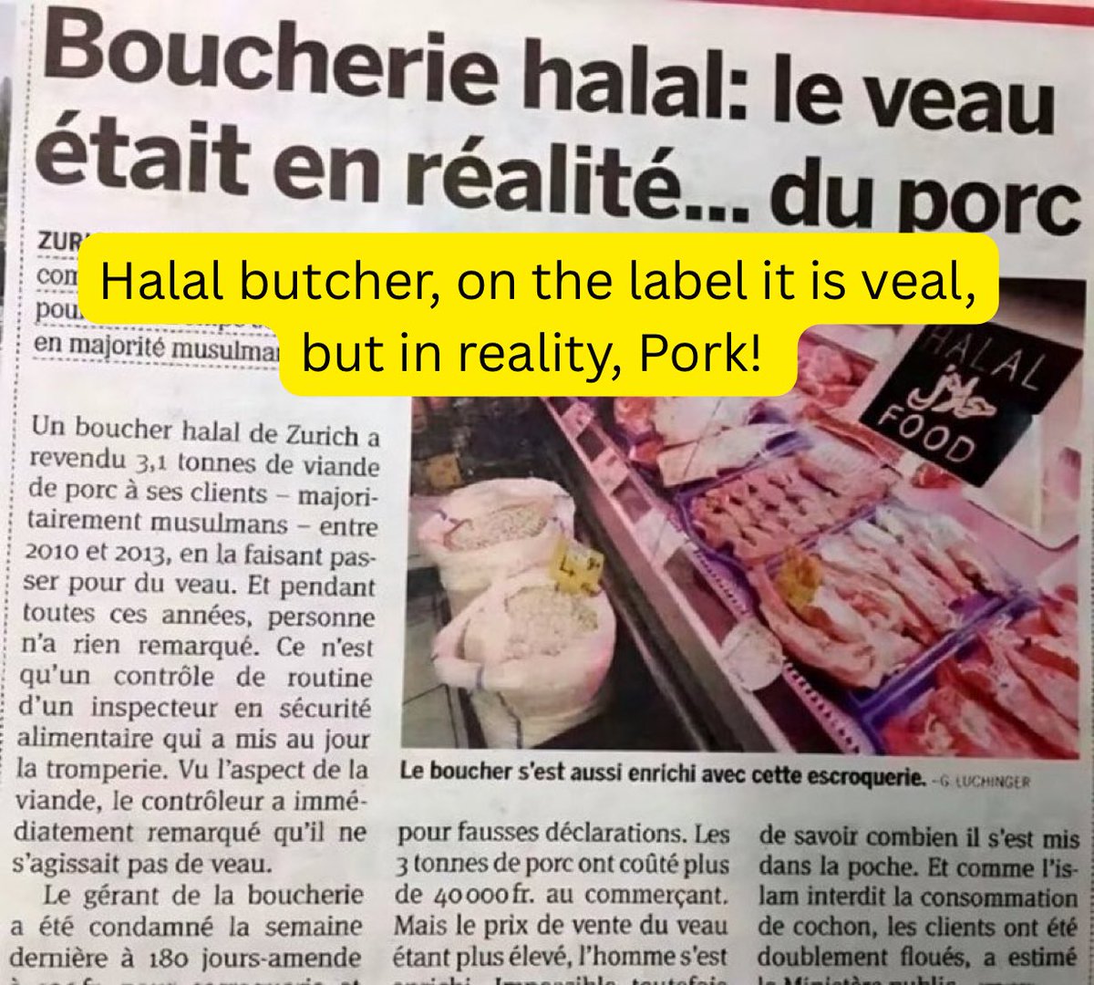 A halal butcher in Zurich was found to have sold 3.1 tons of pork falsely labeled as veal to Muslim customers over a three-year period—without raising suspicion.