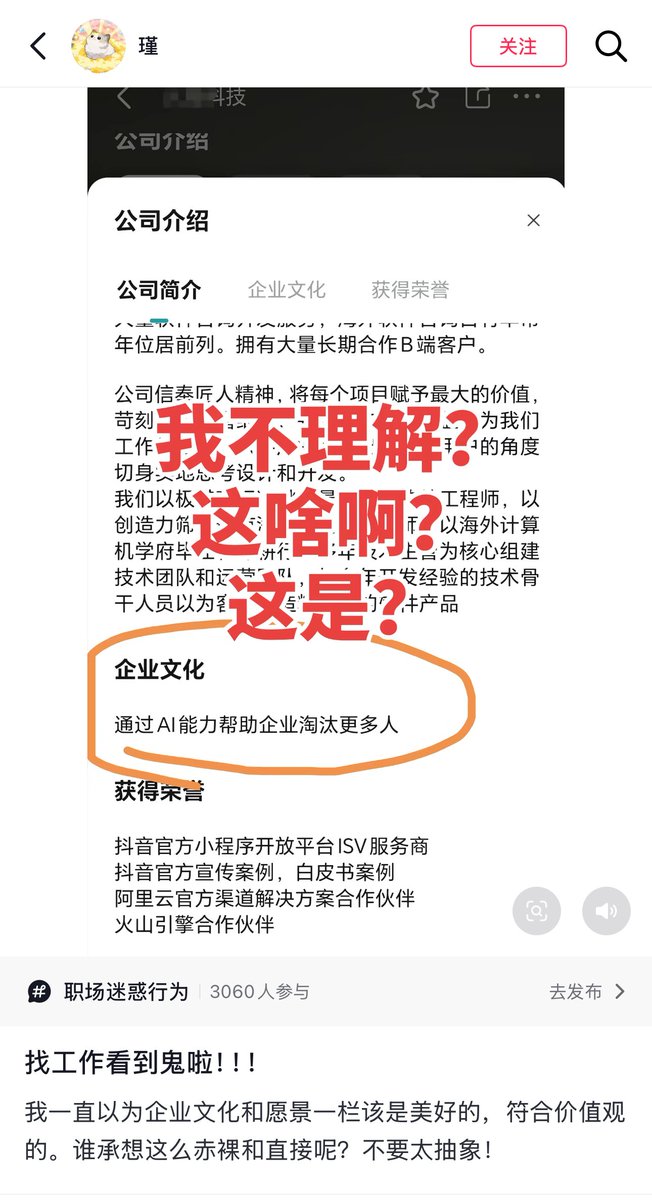 3月25日,四川。一名网友反映称,她在Boos直聘上找工作时,发现一家科技公司的企业文化一栏赫然写着:“通过AI能力帮助企业淘汰更多的人”