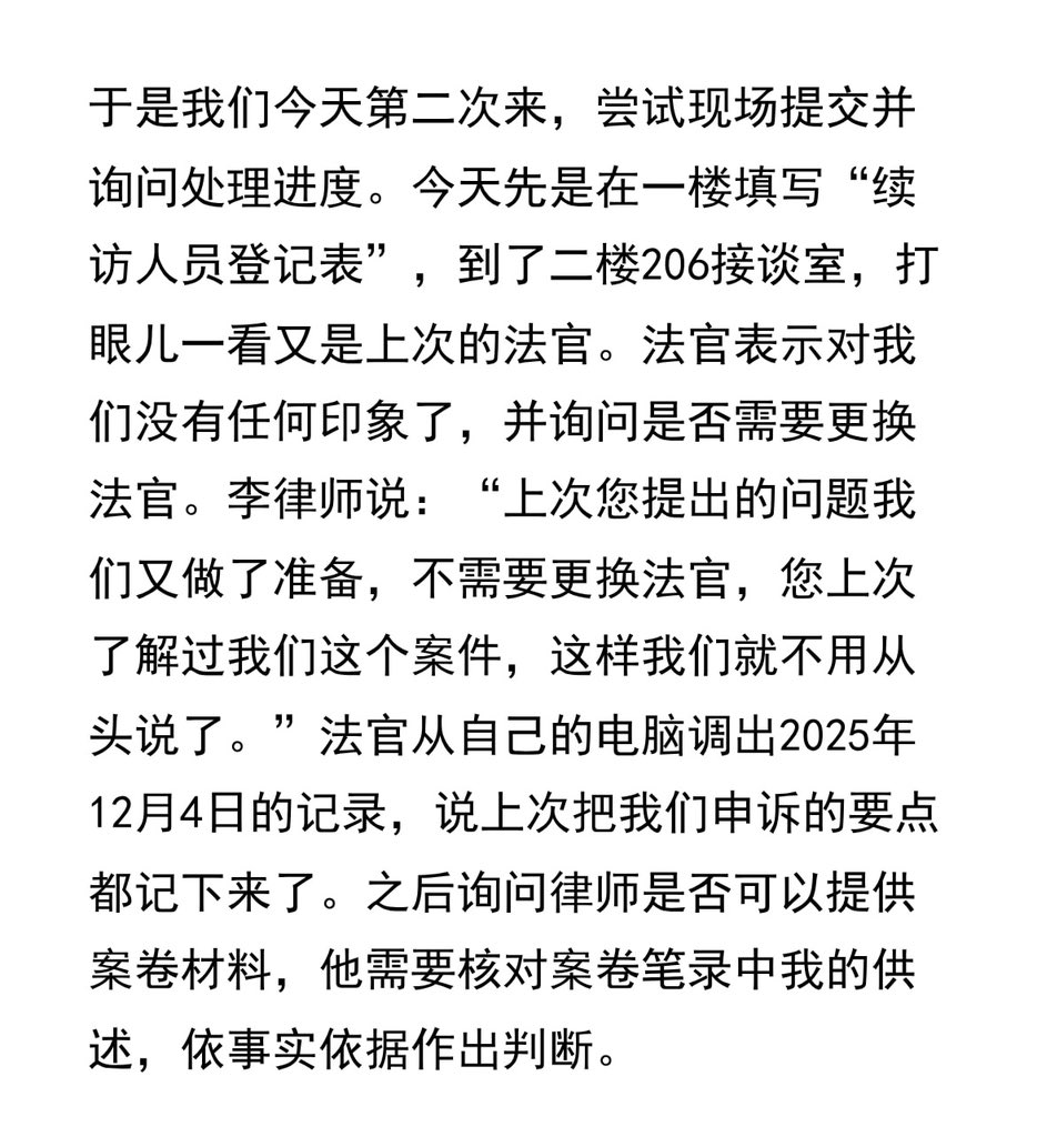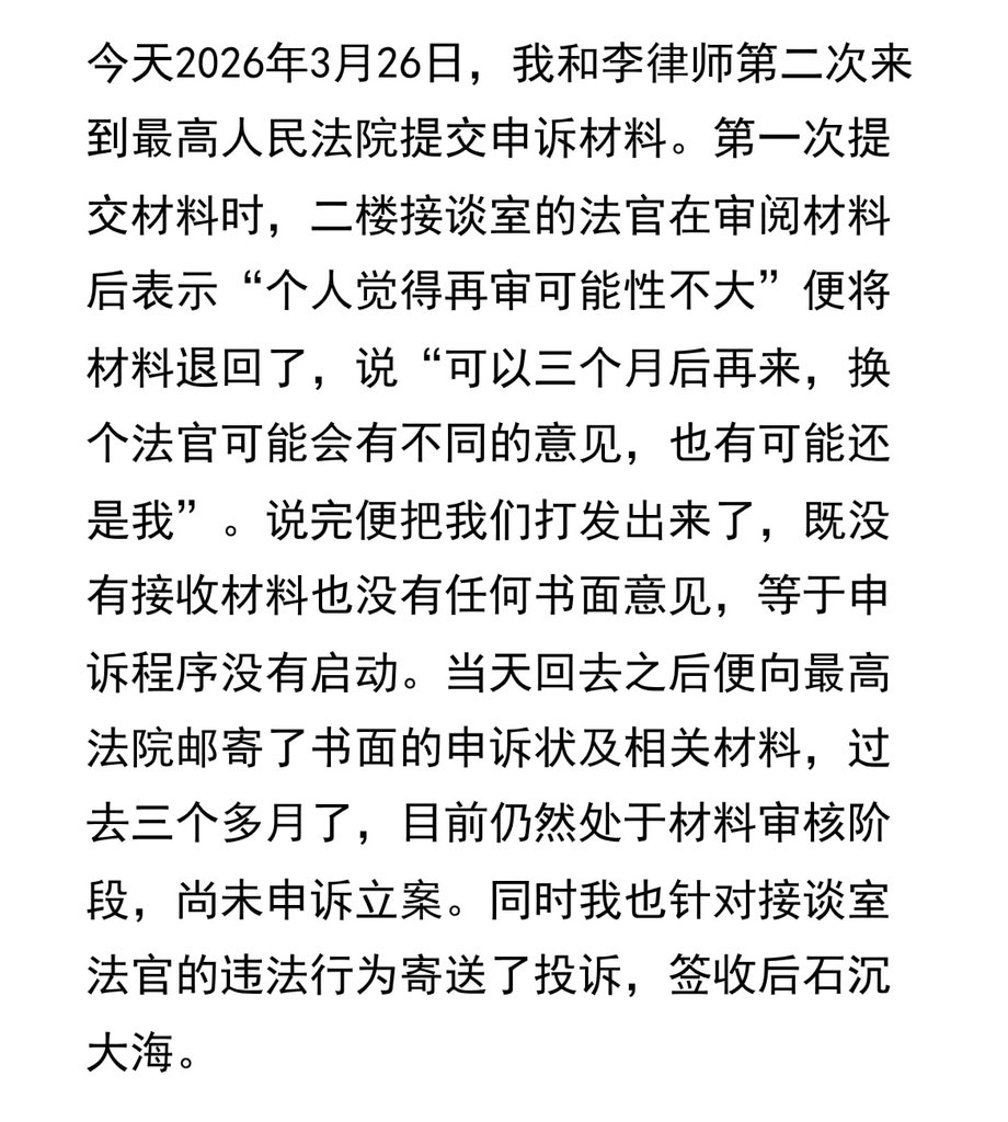 今天2026年3月26日,我和李律师第二次来到最高法院提交申诉材料,又遇到了上次拒收材料的那位法官。他一直坚持口说无凭,要讲事实依据。但我们又怎么可能拿到案卷呢?甚至在山东省高院申诉阅卷,只能看不让抄。最后,法官让我们回去等他们调卷,三个月后再到现场询问进度。