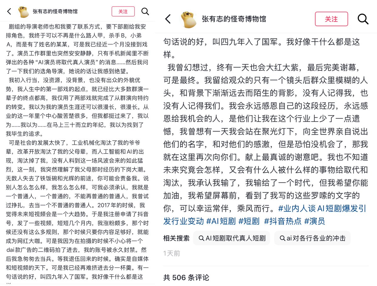 结果最近一个月演员群里都安安静静,手机则不断弹出各种“AI取代将取代真人演员的消息”于是他向导演询问,得到了一个让他绝望的回复:“真人短句以后不可能会有了”“你已经失业了”