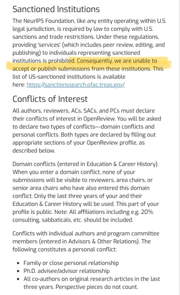 据悉,此次调整的背景与NeurIPS方面执行美国相关出口管制政策有关。此前有消息称,NeurIPS限制来自部分被美国制裁机构及公司的研究人员投稿或参与会议,引发中国学术界对学术开放性与公平性的质疑。