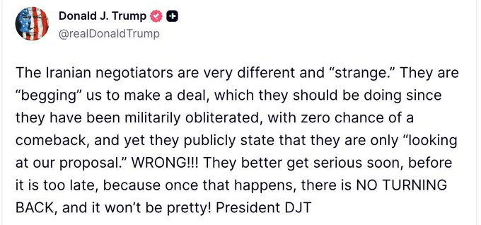 川普发贴称:伊朗谈判代表表现"非常奇怪",他们在"乞求"达成协议——鉴于其军事力量已被彻底摧毁、毫无翻盘可能,这是理所应当的。然而他们却公开声称只是在"研究我们的提案"。大错特错!他们最好尽快认真起来,否则一旦错过时机,将无法回头,后果不堪设想。