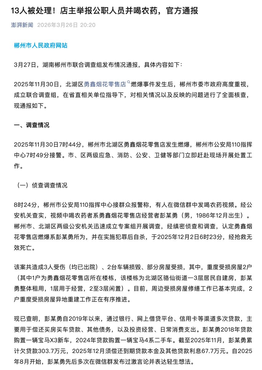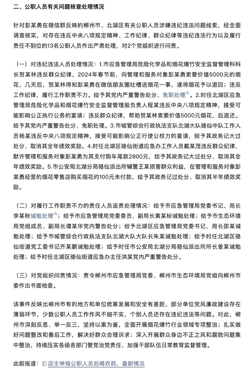 湖南,郴州市。烟花店主举报公职人员并喝农药身亡,官方通报。13人被处理。
