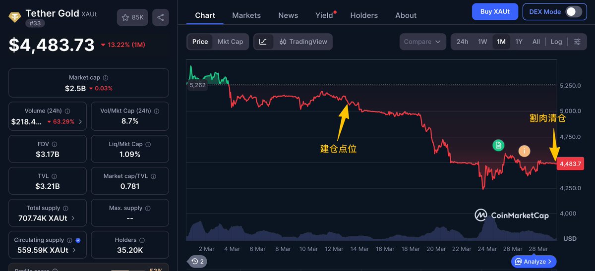 押注黄金反弹的大户 0x1F0…6f53a 在持仓 2 周多后终于将 1869.79 枚 $XAUT 全部割肉,最终亏损 109.6 万美元
