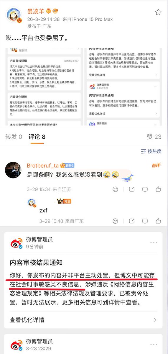 微博方面表示:“不是我们处置的,但博文中可能存在社会实事敏感不良类信息,已被 (有关部门) 责令处置”