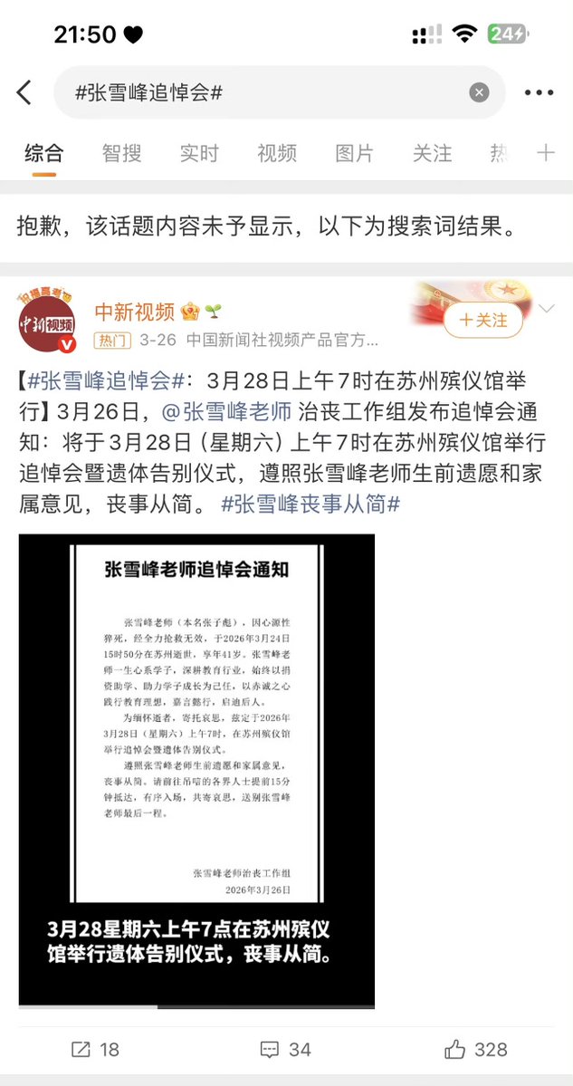 3月29日,多名博主反映,他们发布的“大量市民排长队送别张雪峰”的视频,被微博限制为仅自己可见。还有人因为发布相关视频,账号被封禁15天。