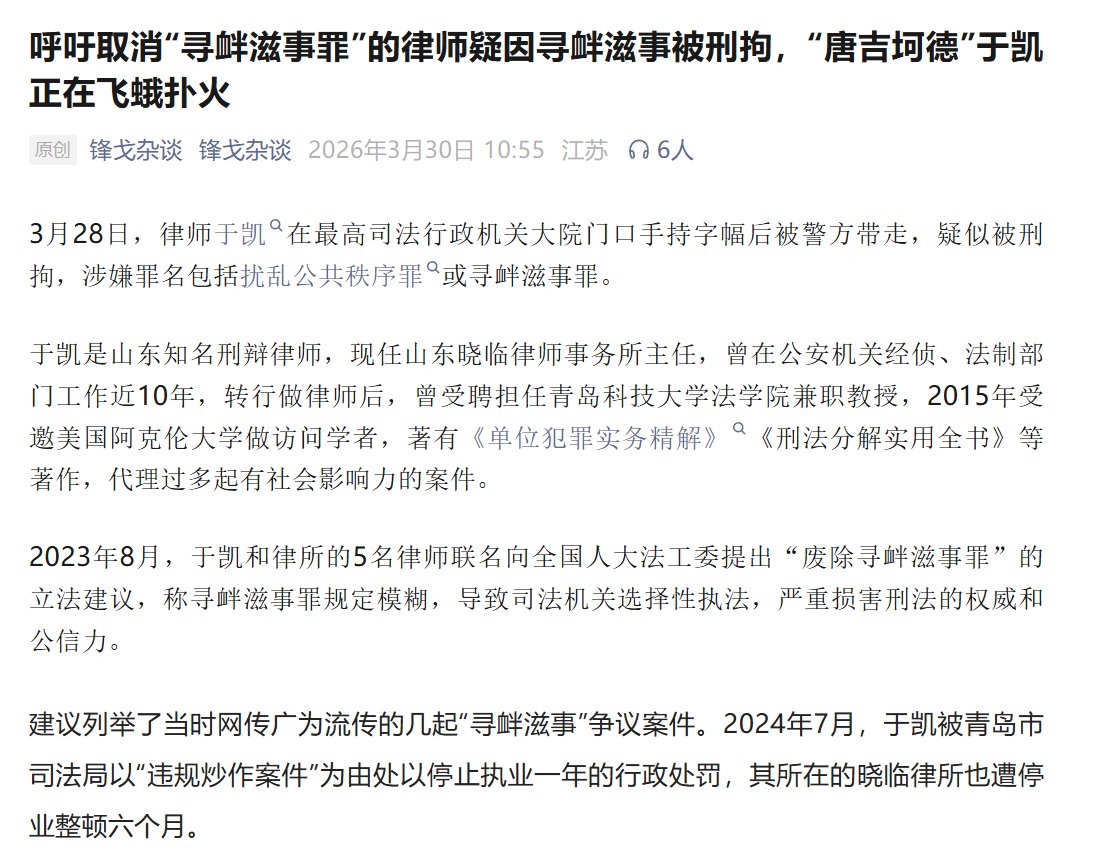 呼吁取消“寻衅滋事罪”的律师疑因寻衅滋事被刑拘。