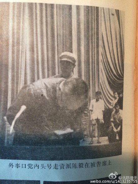 翻文革小画册,见批斗陈毅万人大会场景。主会场是"严肃庄严",悬挂巨大横幅和标语,周恩来和谢富治坐主席台上,革命外交战士姚登山主持。陈毅弯腰站在台前,并不时做记录。呼喊口号有"打倒陈毅是百年大计""打倒陈毅是世界共产主义运动需要""誓与陈毅血战到底""打倒中国葛罗米柯" ---@北陈徒手