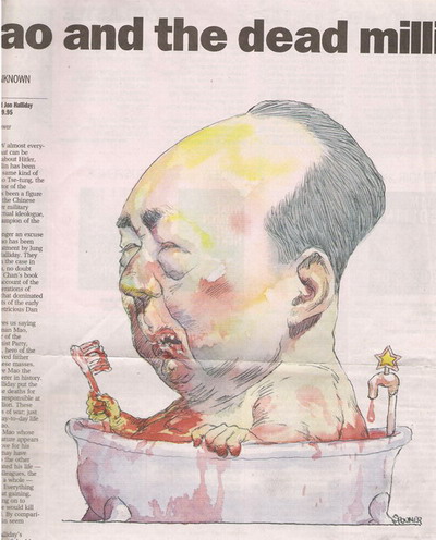 前三十年,新中国创造了四项世界记录: 1.大跃进,在风调雨顺下饿死数千万农民,是人类史上最大规模饥荒。 2.上山下乡,十年内1600万城里人下放,最大规模流放。 3.文革,挑拨全国民众互殴,牵连一亿人,最大规模內讧。 4.镇反杀地主,反右迫害知识分子,破四旧毁文物焚书,是最大规模传统文化浩劫。 图:澳洲媒体评论张戎毛传所附漫画,指毛浸浴在中国人民的鲜血中。