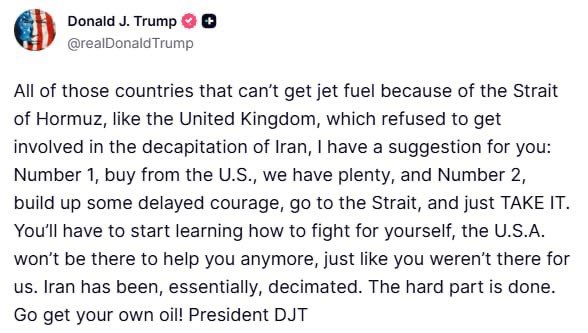 美國將不再援助那些因霍爾木茲海峽封鎖而無法獲取燃料的國家,建議:要麼從美國購買燃料,要麼大膽些,自己佔領霍爾木茲海峽,伊朗實際上已經被擊敗了——最艱難的時刻已經過去了——特朗普