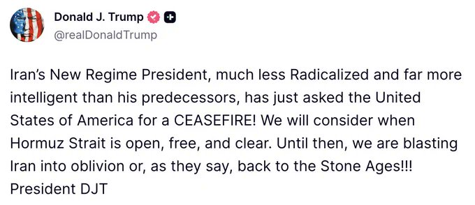 我们将在霍尔木兹海峡开放、自由、畅通之后予以考虑。在此之前,我们将把伊朗炸回石器时代!