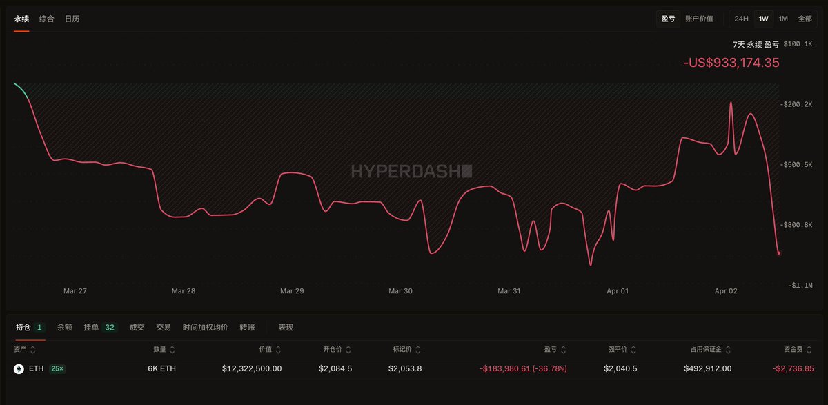 剩余 6000 枚 $ETH 25x 多单,开仓价 $2084.5,清算价 $2040.5,还剩下 13 刀的清算空间;这还是在刚才主动割肉 1700 ETH 亏损 4.8 万美元情况下,不然清算空间挤压到只有 5 刀了…