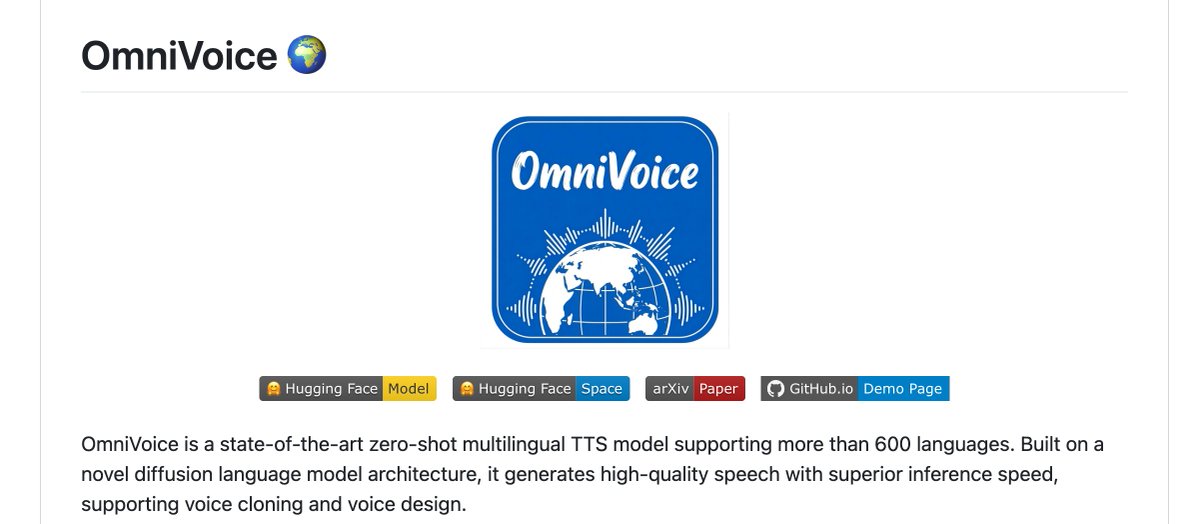 OmniVoice — 一个零样本 TTS 模型,支持 600+ 语言,覆盖面直接拉满: