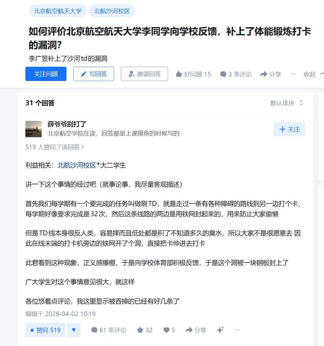 近日,北京航空航天大学,北航沙河校区规定:学生们要走过一条布满各种障碍的路线,到另一端打卡,且每学期要完成32次,以此锻炼学生们的体质。学生们将其称为“刷TD"