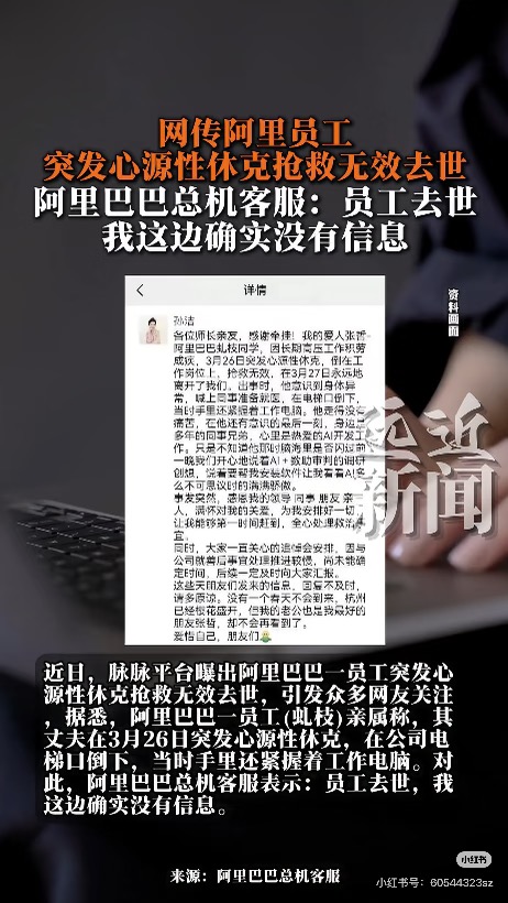 4月1日,网传阿里巴巴一名员工,因突发心源性休克抢救无效去世。