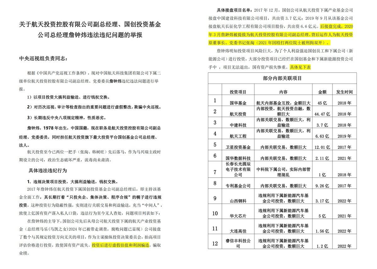 网友投稿:举报 马兴瑞主政时期设立的公司”航天投资控股公司“领导 詹钟炜 违纪违法。