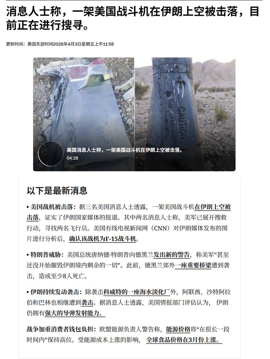 4月3日,据CNN和路透社报道,据几名美国消息人士透露,一架美国战斗机在伊朗上空被击落,这是自近五周前战争爆发以来已知的首起此类事件。