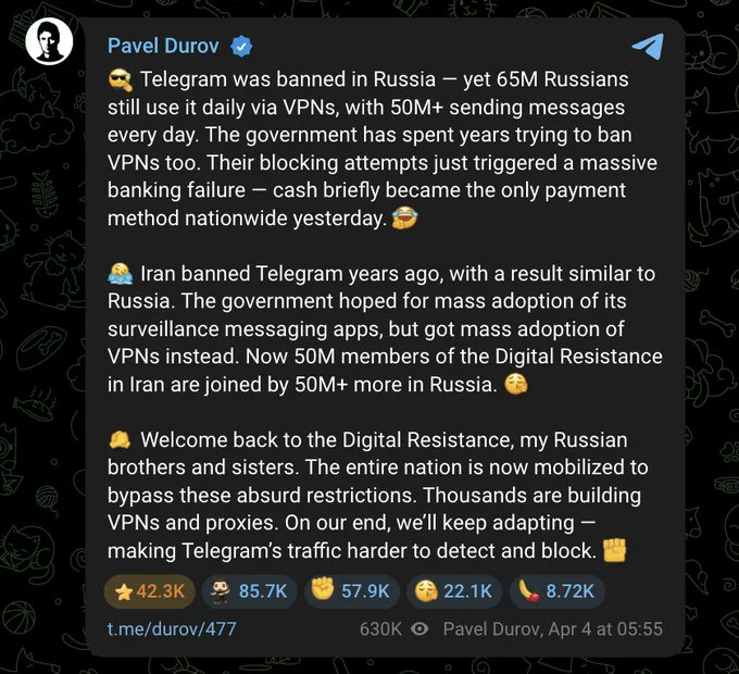 Telegram创始人帕维尔·杜罗夫表示,俄罗斯和伊朗各有数千万用户通过VPN翻墙使用该平台,称这是一场日益壮大的"数字抵抗"运动,两国当局对封锁令的执行愈发力不从心。