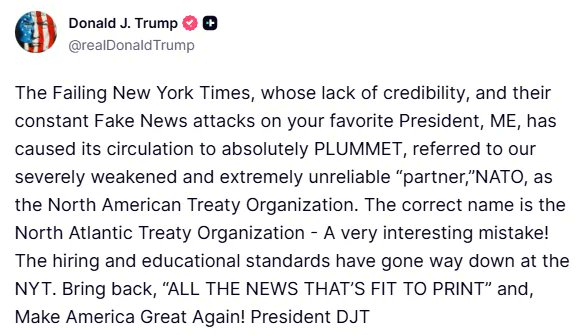 他们甚至把我们那个严重削弱、极其不可靠的“伙伴”——NATO,错误地称为“北美条约组织”。正确的名字是“北大西洋公约组织”——这是一个非常“有趣”的错误!