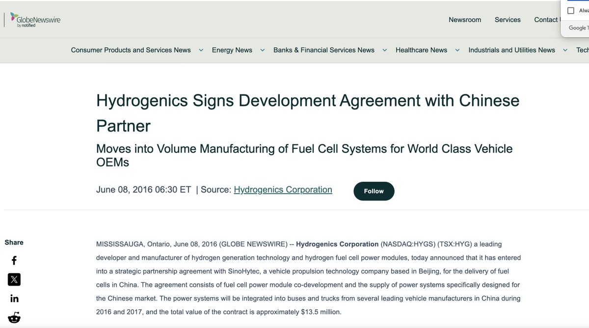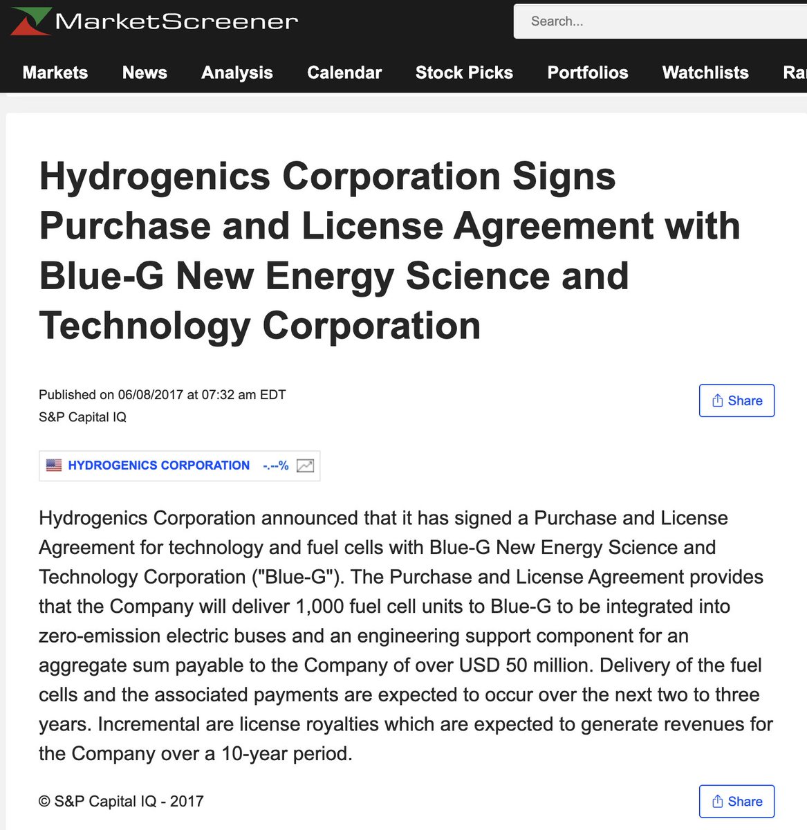 💥 In 2017, Hydrogenics signed another agreement with Beijing Blue-G New Energy Technology Co., Ltd. (“Blue-G”), involving the purchase and licensing of fuel cell technology.