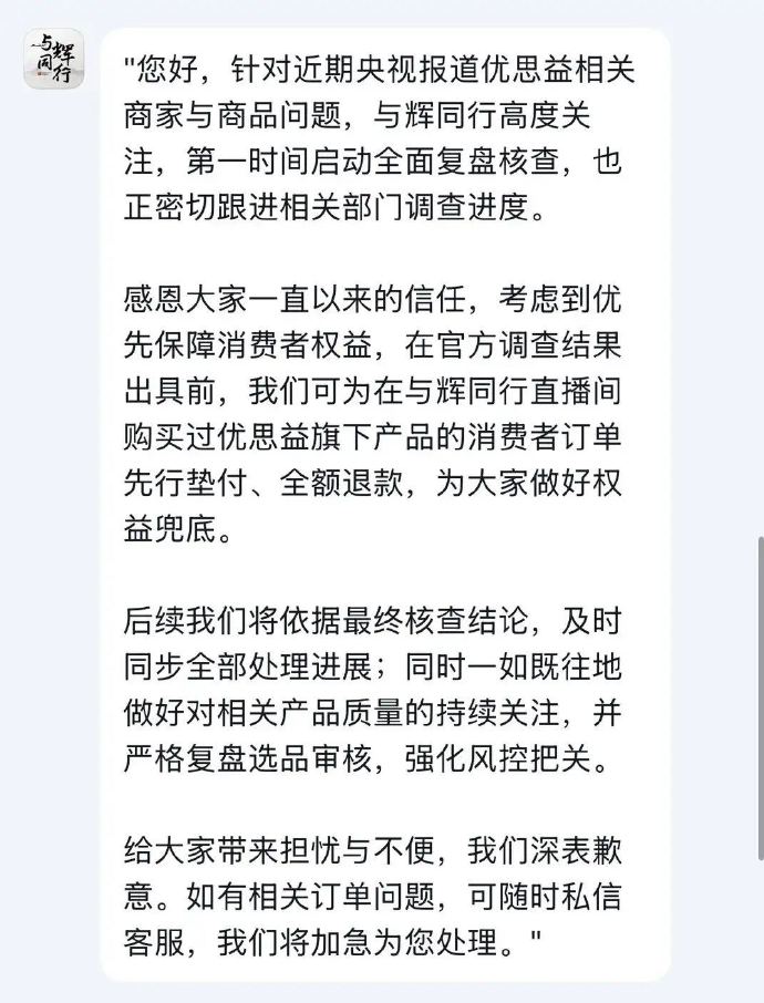 起因是与辉同行带货的保健品“优思益”被央视曝出虚构澳洲产地,伪造工厂信息。