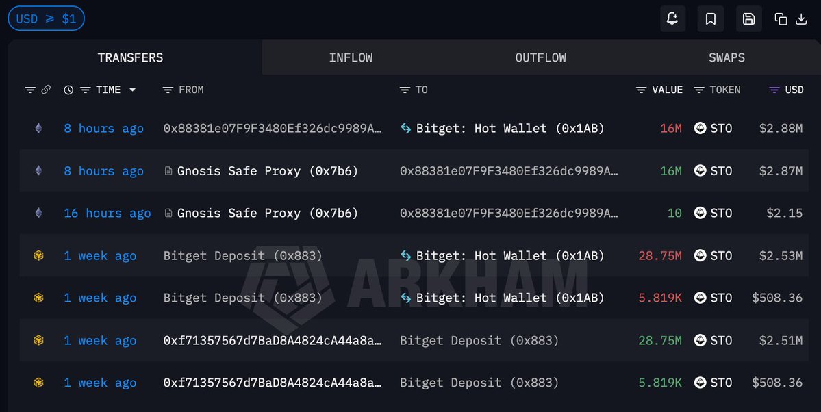 StakeStone 团队关联地址 8 小时前向 #Bitget 充值 1600 万枚 STO,价值 287 万美元;其资金来源为地址 0x1Fe…19Bb5,即 $STO 代币部署地址