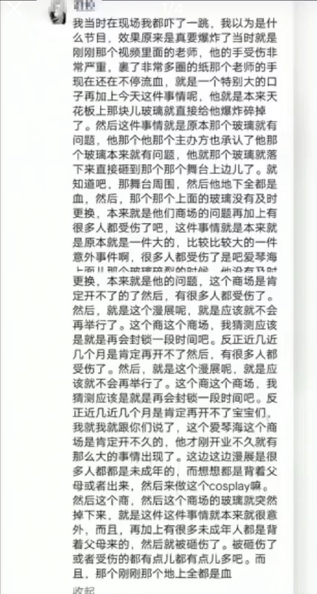 多名coser、观众被玻璃划伤,头部、手臂、脸部均有伤口,有人被紧急送医缝针。