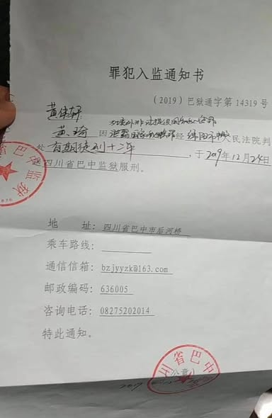 2019年12月24日黄琦入四川省巴中监狱服刑。