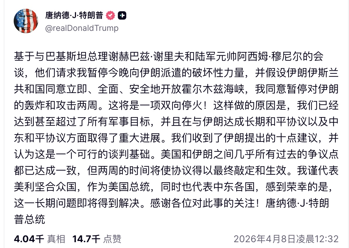 美东时间4月7日晚,特朗普称将“最后期限”延长两周