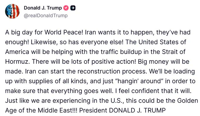 🚨川普刚刚发帖:中东将迎来“黄金时代”,伊朗启动重建,资金大规模流入“这是世界和平的重要一天!伊朗希望实现这一点,他们已经受够了!同样,其他所有人也是如此!美利坚合众国将协助解决霍尔木兹海峡的航运拥堵问题。接下来将会有大量积极行动,巨额资金也将流动起来。