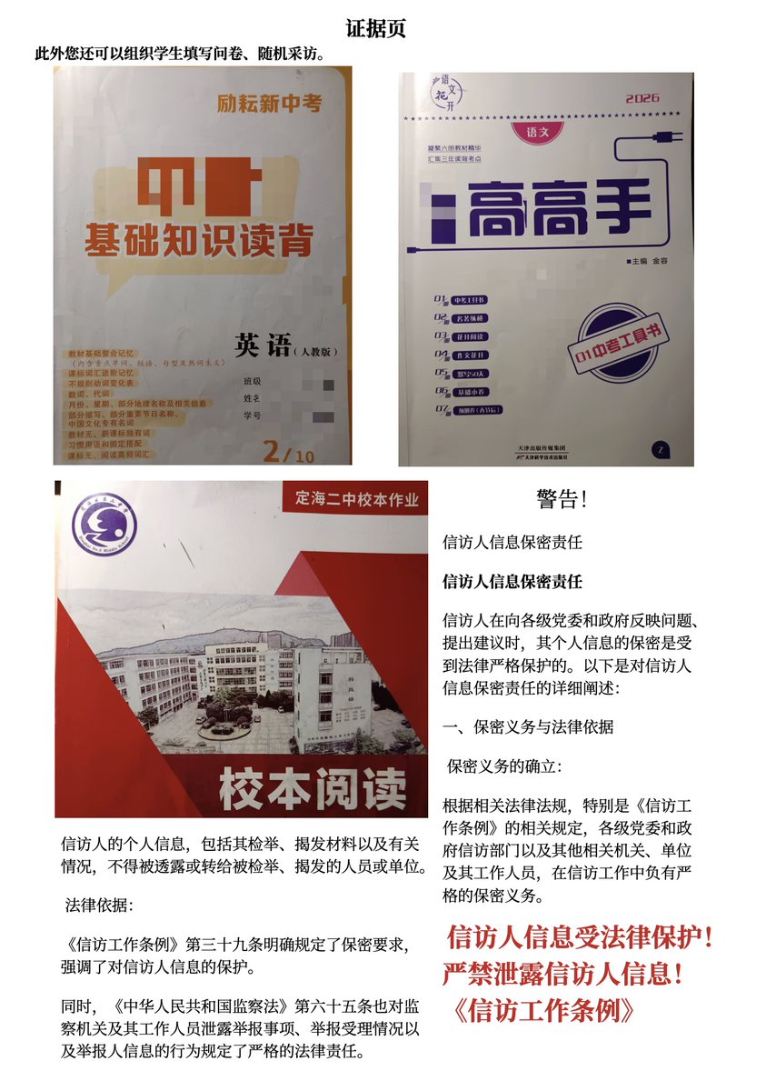 但是定海区第二中学却屡屡顶峰作案,甚至以威胁学生、警告学生等方式要求“禁止传播相关信息”。我特此匿名举报,请求领导公正处理,移学生背上之大山。