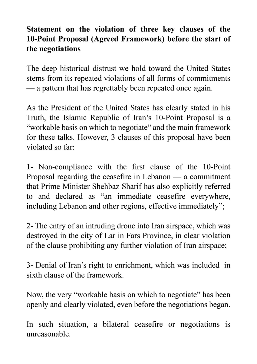 正如美国总统在其 Truth(社交平台)上明确表示的,伊朗伊斯兰共和国提出的“10点方案”是“可作为谈判基础的可行方案”,也是本轮谈判的主要框架。然而,截至目前,该方案中的三项条款已被违反:
