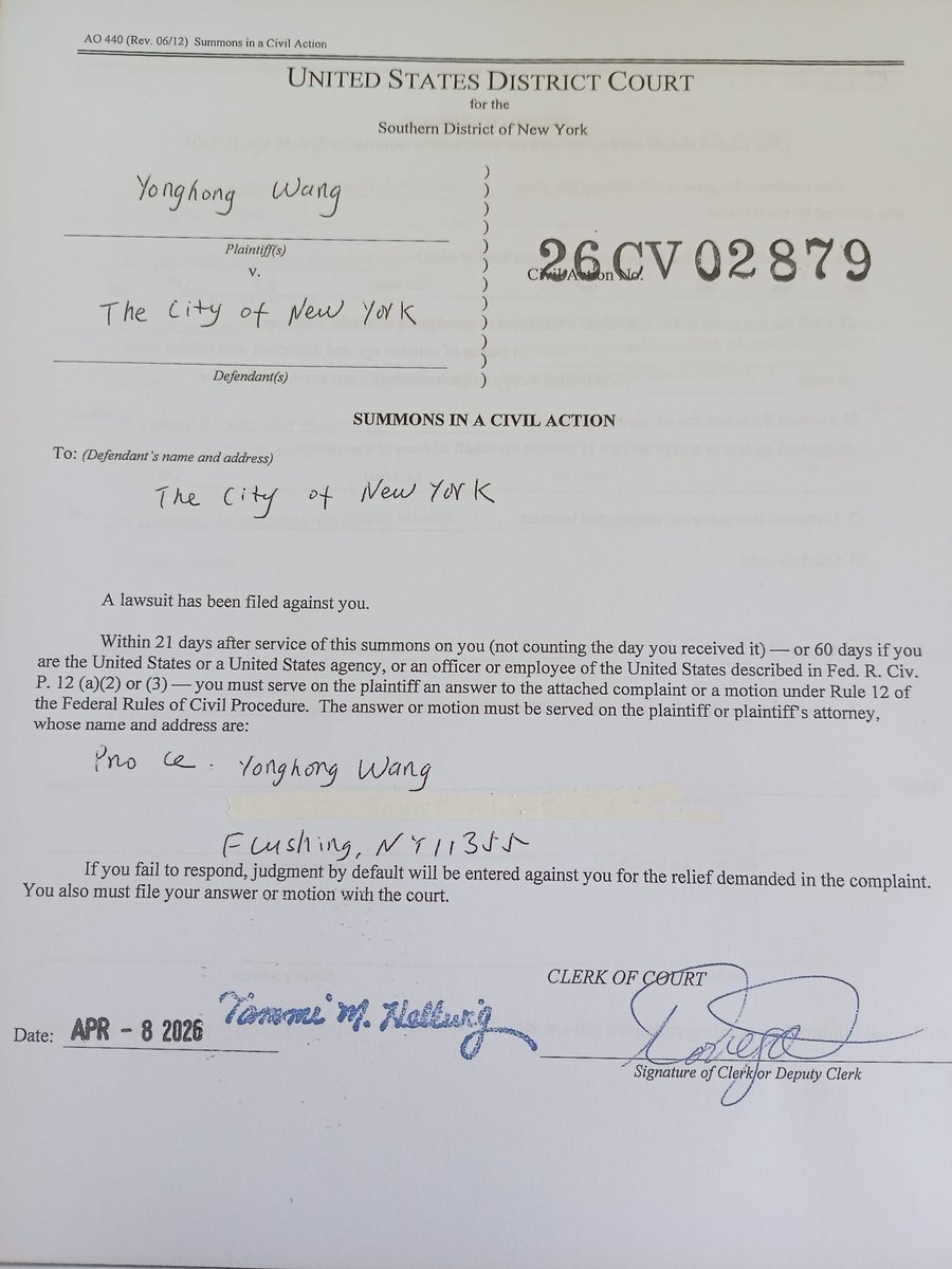 【纽约维权人士王永红正式起诉纽约市政府,指控警方在涉华和平抗议中存在系统性失职】2026年4月8日,中国维权人士王永红在纽约南区联邦地区法院(SDNY)对纽约市政府提起民权诉讼(案号:26 CV 02879)。