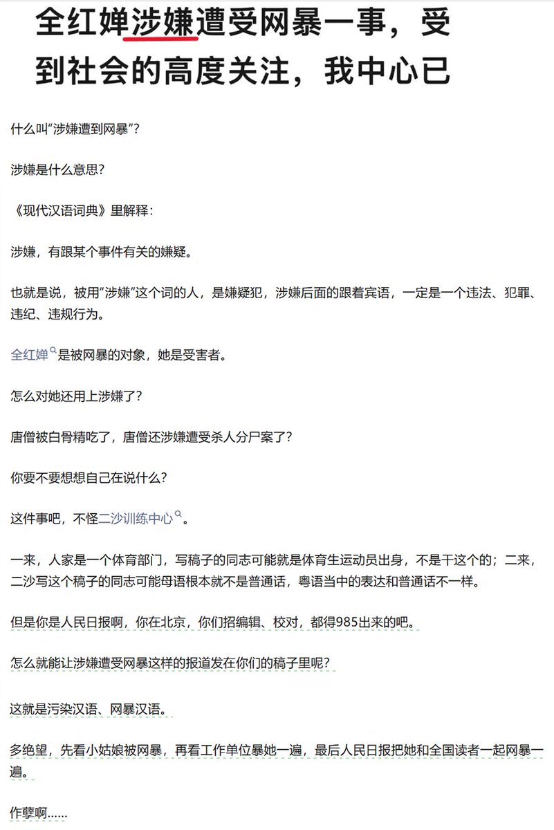 人民日报等官媒在报道中称:“全红婵涉嫌遭受网暴已报警” 有博主质疑:“涉嫌”是指有人犯下了罪行,只是未经审判不能确定是他干的,所以叫“涉嫌”但你不能说“李家涉嫌被盗,李小丫涉嫌被强奸”,因为这相当于在说“被盗、被强奸”并不一定真的发生了。 另一名博主表示:全红婵是被网暴的对象,她是受害者。怎么对她还用上涉嫌了?唐僧被白骨精吃了,唐僧还涉嫌遭受杀人分尸案了?