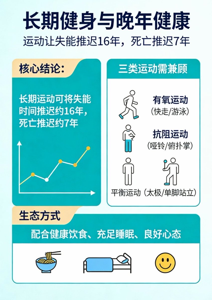 即便晚年运动量大幅减少,早年的运动积累仍具有持续的保护效应。可见,健身的目标不是活得久却卧床不起,而是延长“健康寿命”,让身体的功能性资产多维持几十年。